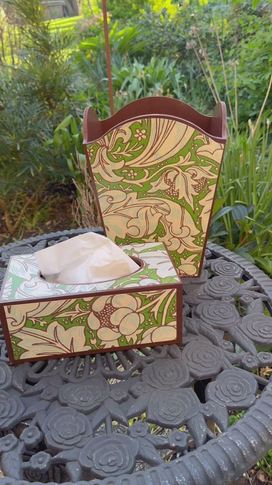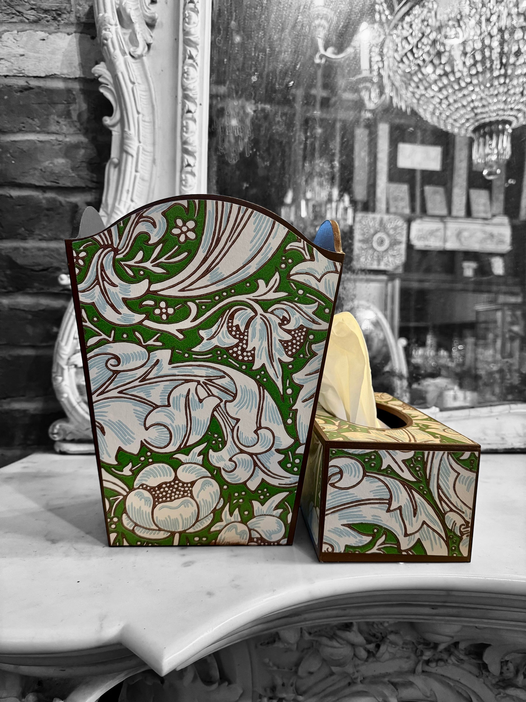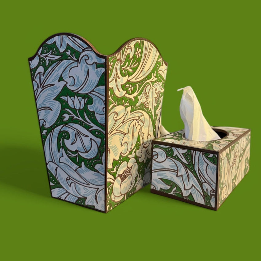 Bachelor’s Button waste bin set, handcrafted wooden tissue box cover, William Morris archival patterns, Ben Pentreath Queen Square collection, Green home accessories, bespoke decoupage homeware, maximalist interiors, heritage-inspired home accessories, sustainable handmade gifts, British artisan creations, Brown home accessories, retro home accents, traditional English home décor, vintage-inspired room accessories.