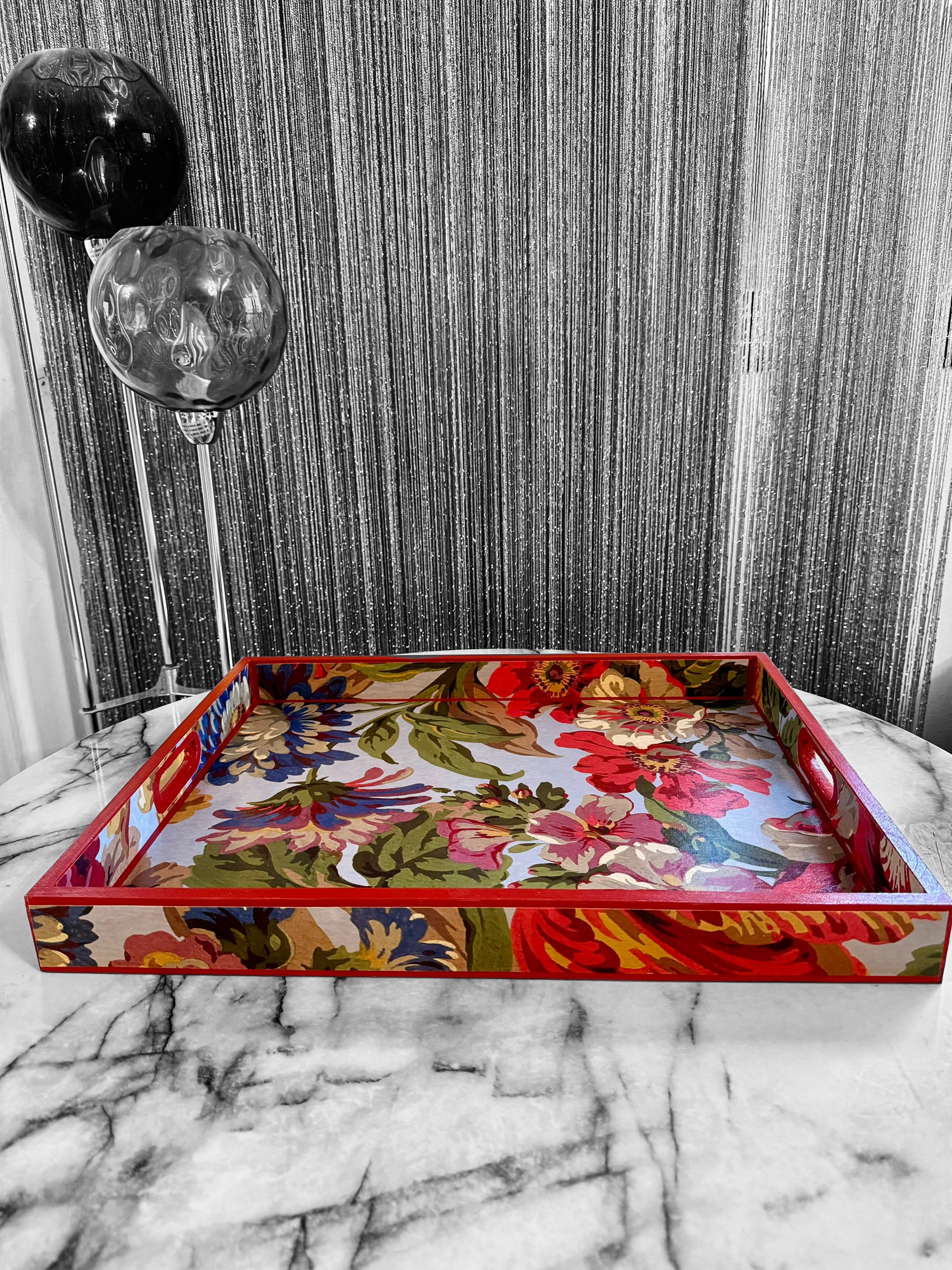 Tags: House of Hackney tray, Florescence tray decor, red serving tray, bespoke handmade tray, pinewood ottoman tray, luxury wooden tray, vibrant statement decor, bold decorative tray, elegant centrepiece, House of Hackney serving tray, floral home decor, maximalist statement decor, statement tray, bold and bright home decor.