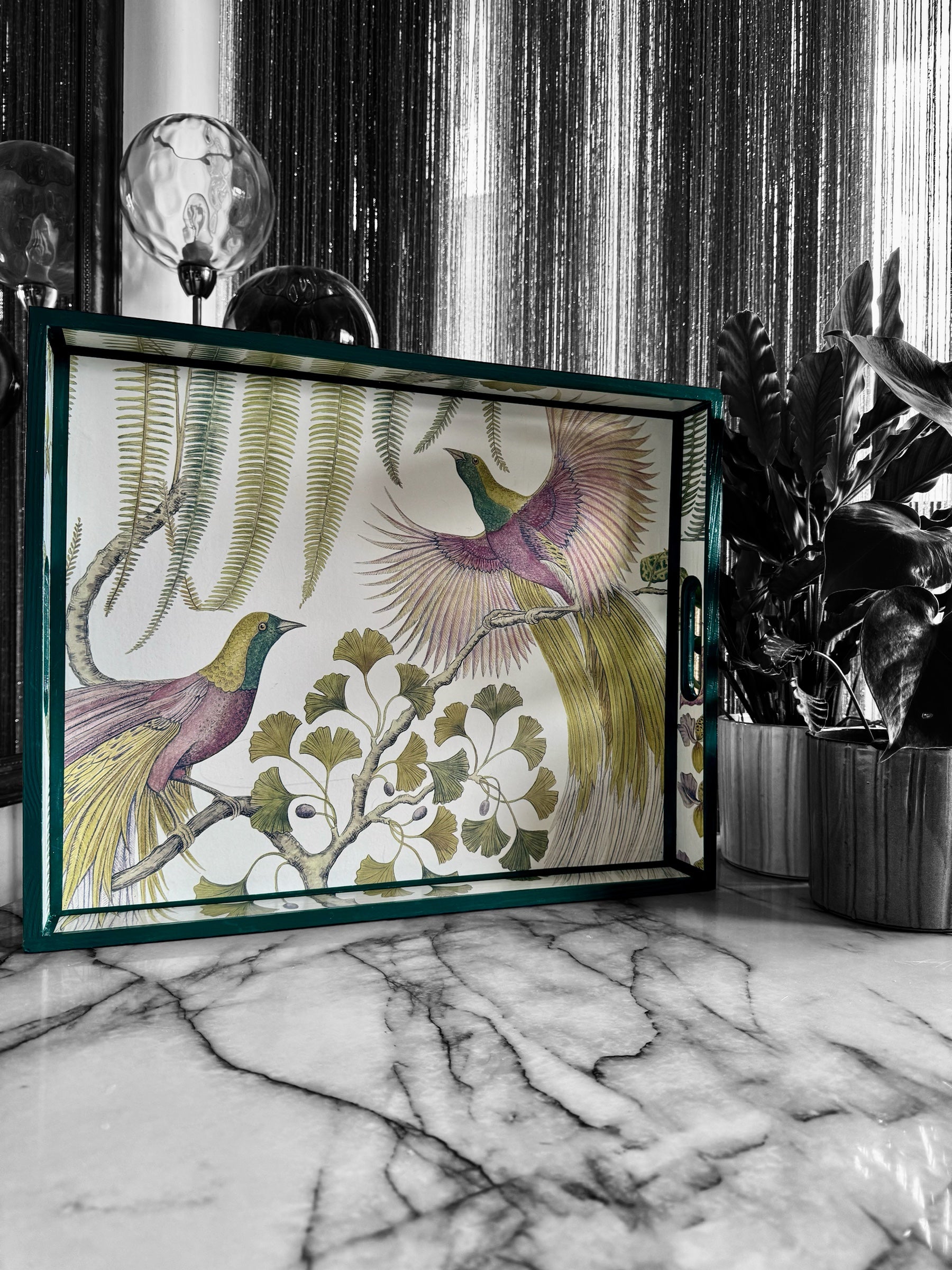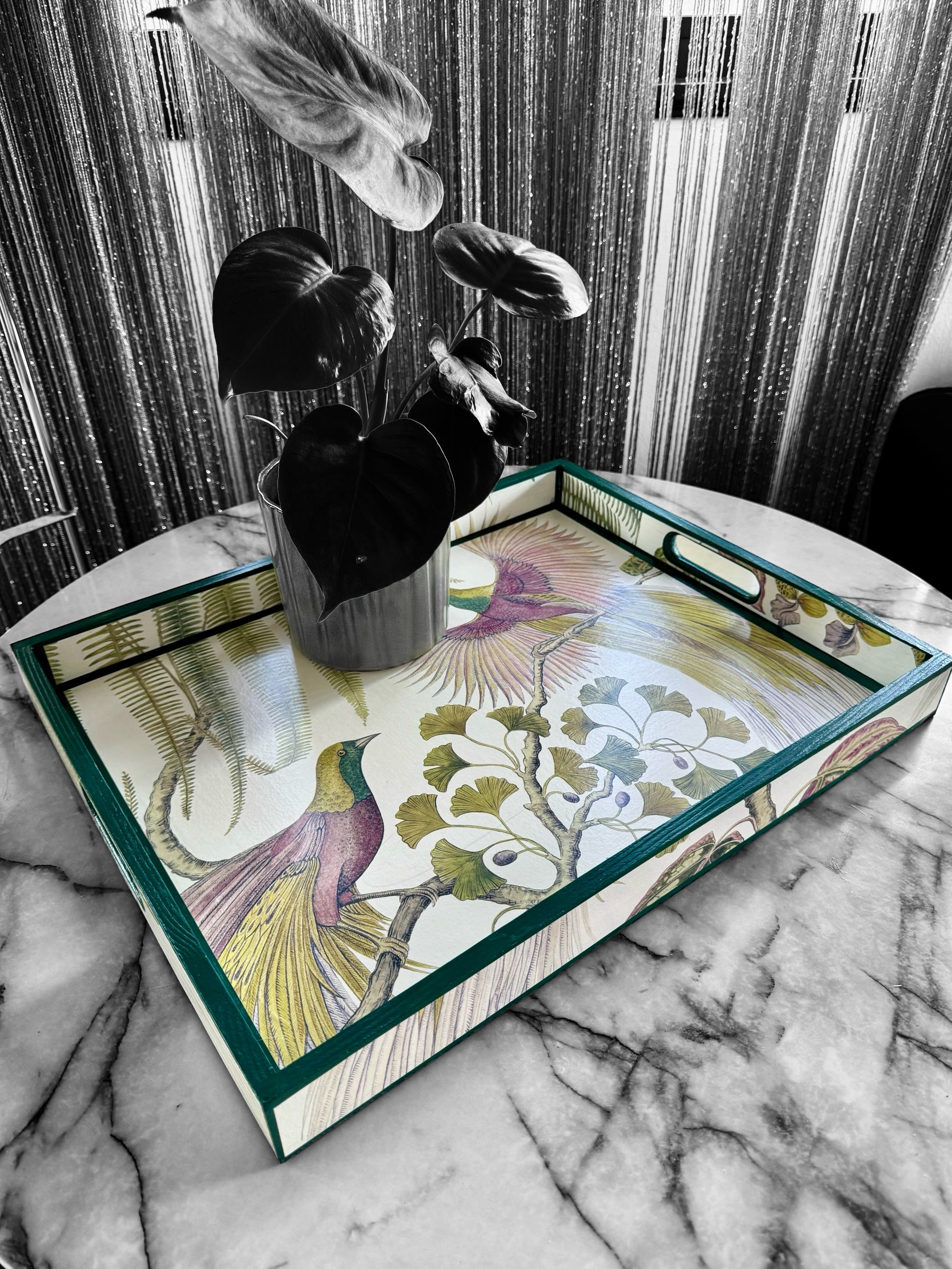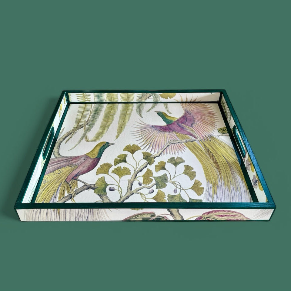 Tags: Sanderson tray decor, Birds of Paradise tray, teal green tray, bespoke serving tray, handmade pinewood tray, vibrant coffee table tray, sustainable interior accessories, large decorative tray, square ottoman tray, maximalist home decor, bold heritage tray, handcrafted UK decor, unique gift tray, exotic home centrepiece, tropical tray.